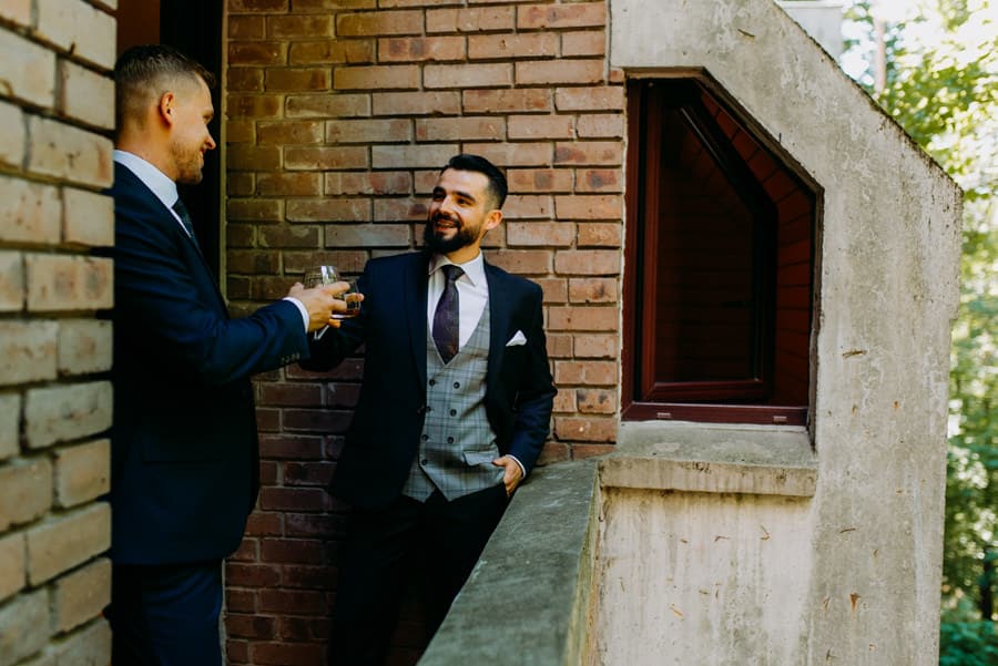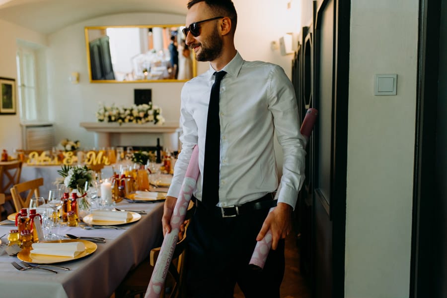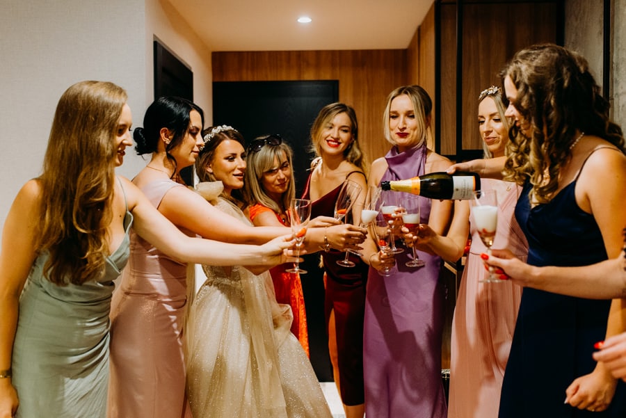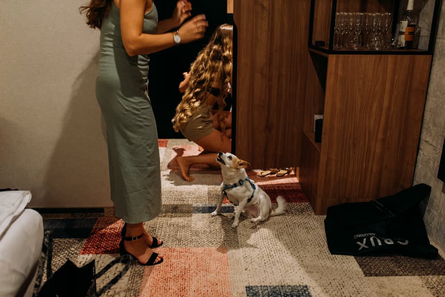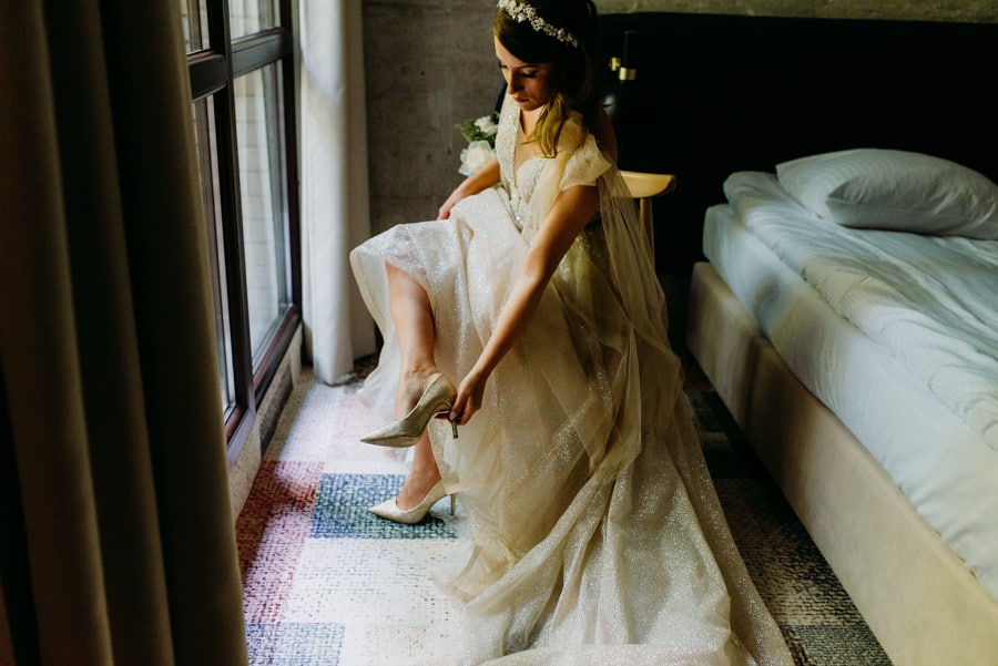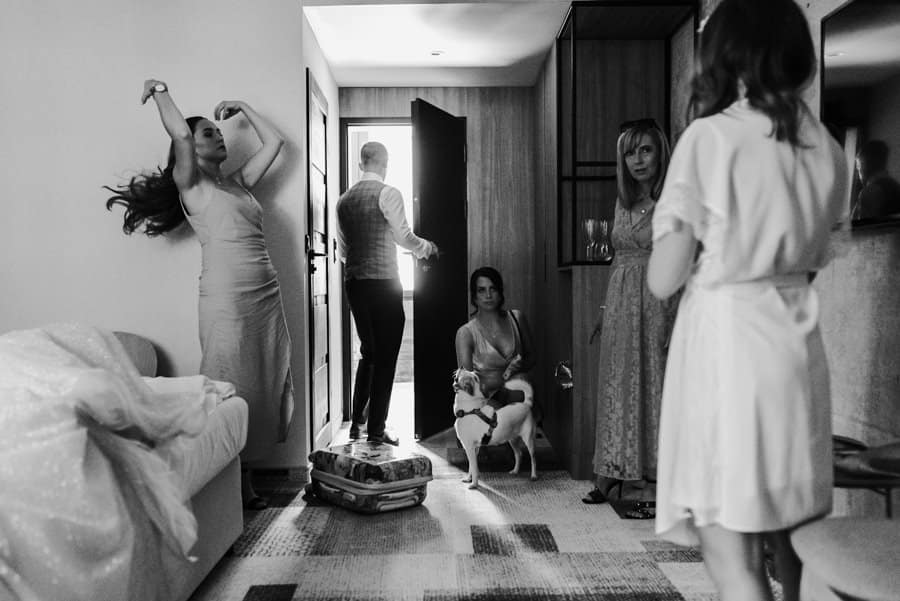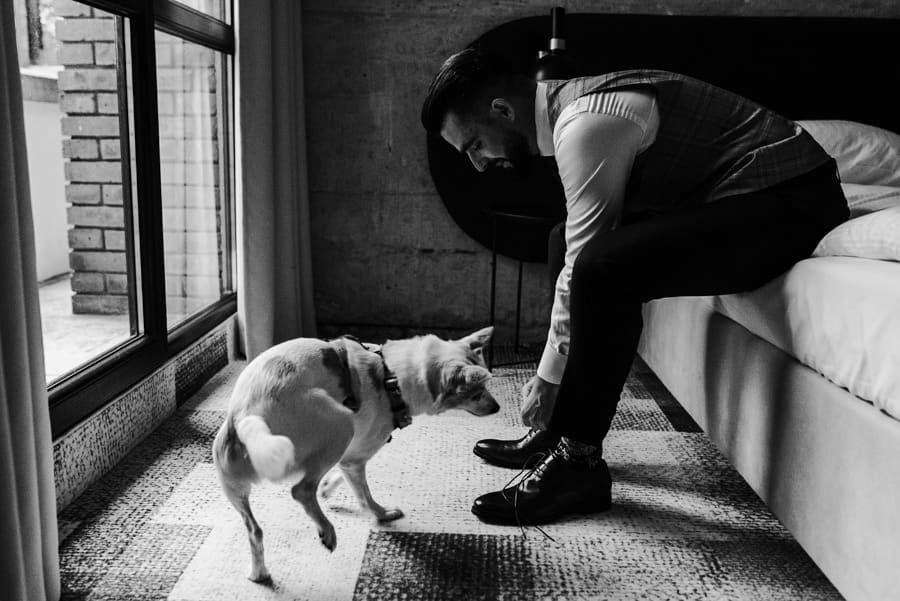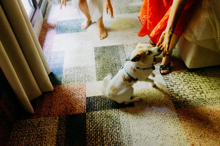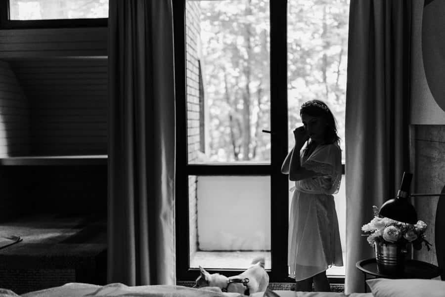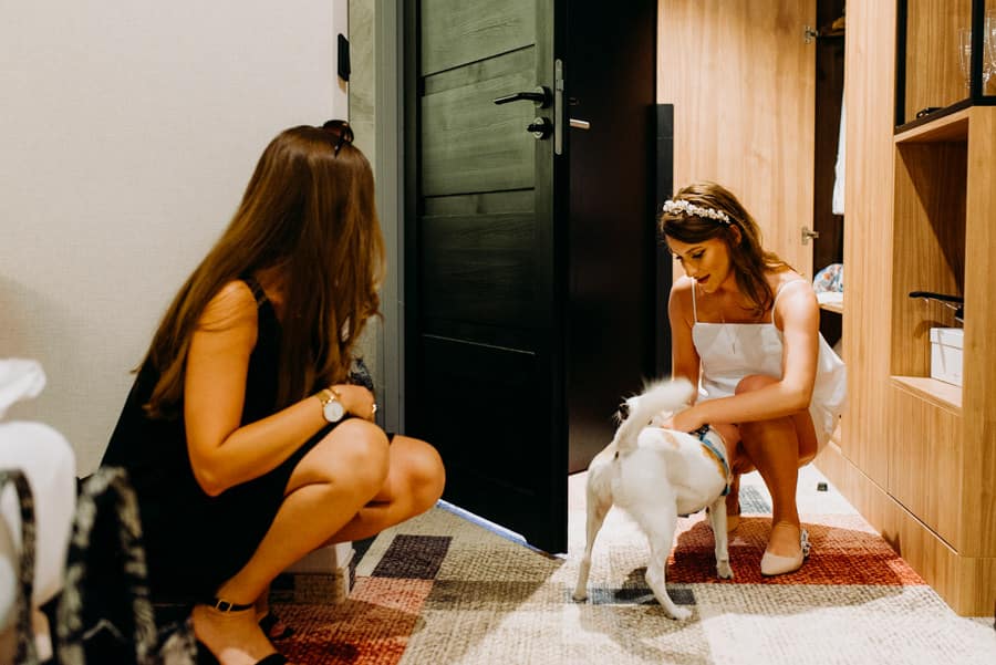 Już od samego rana wiedziałem, że ten dzień będzie wyjątkowy. Przygotowania odbywały się w pięknych, stylowych apartamentach, z których roztaczał się niesamowity widok. Dominika z kieliszkiem prosecco w dłoni, powoli zamieniała się w Pannę Młodą – uśmiechniętą, promienną i absolutnie spokojną. W tle krzątał się ich mały, uroczy piesek, który bez dwóch zdań skradł kilka ujęć – zupełnie zasłużenie.