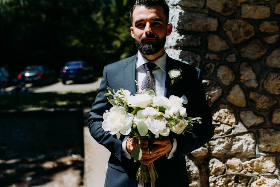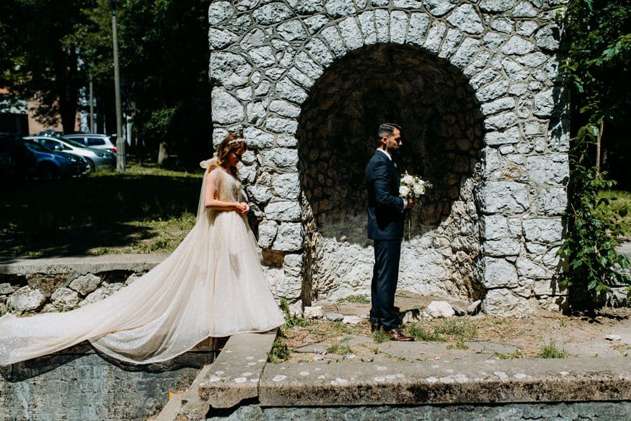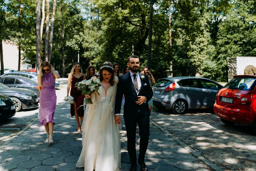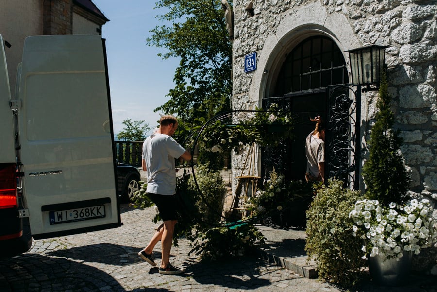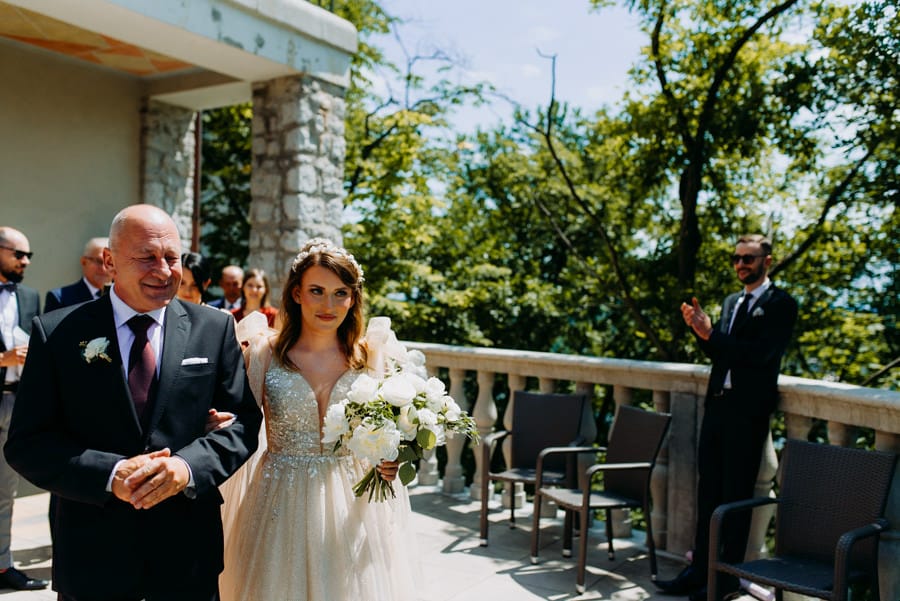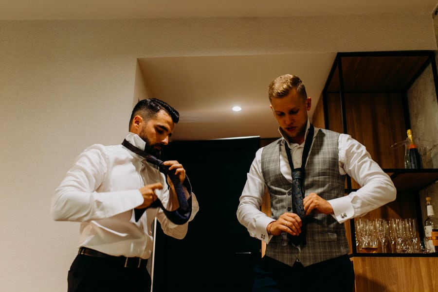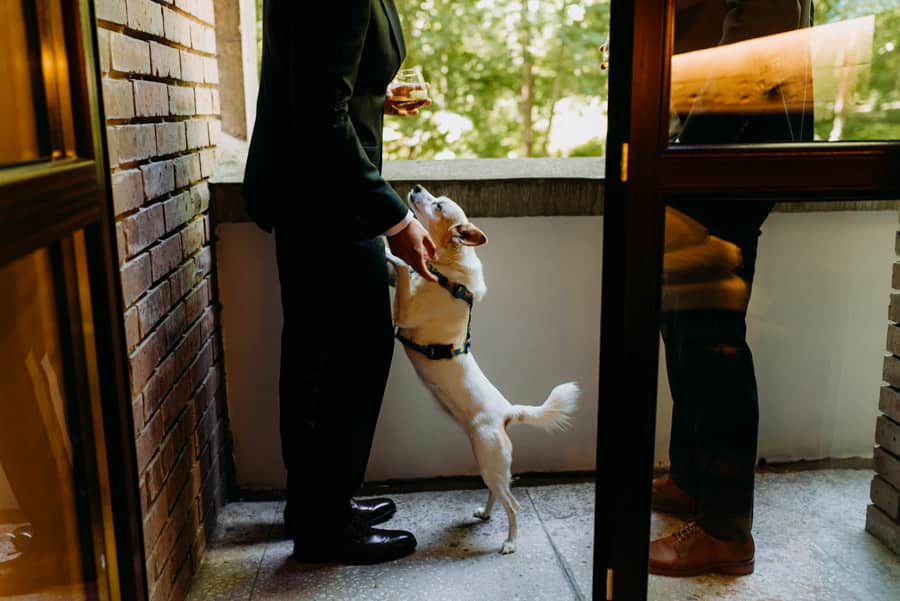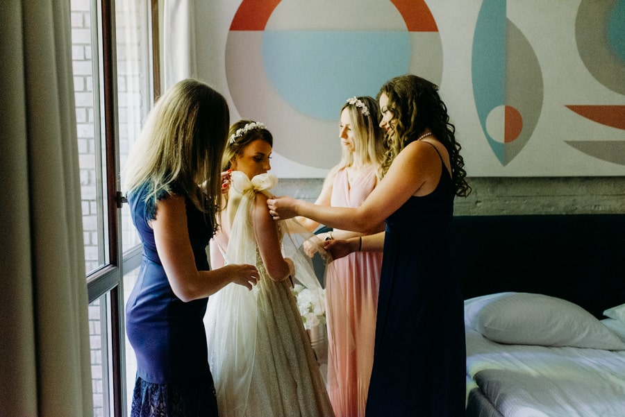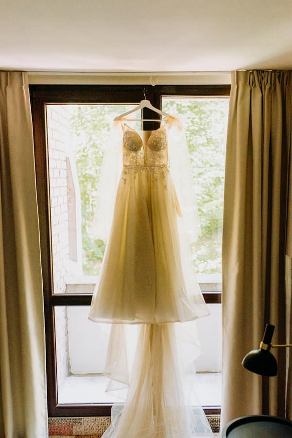 Już od samego rana wiedziałem, że ten dzień będzie wyjątkowy. Przygotowania odbywały się w pięknych, stylowych apartamentach, z których roztaczał się niesamowity widok. Dominika z kieliszkiem prosecco w dłoni, powoli zamieniała się w Pannę Młodą – uśmiechniętą, promienną i absolutnie spokojną. W tle krzątał się ich mały, uroczy piesek, który bez dwóch zdań skradł kilka ujęć – zupełnie zasłużenie.