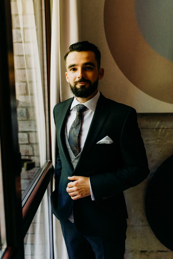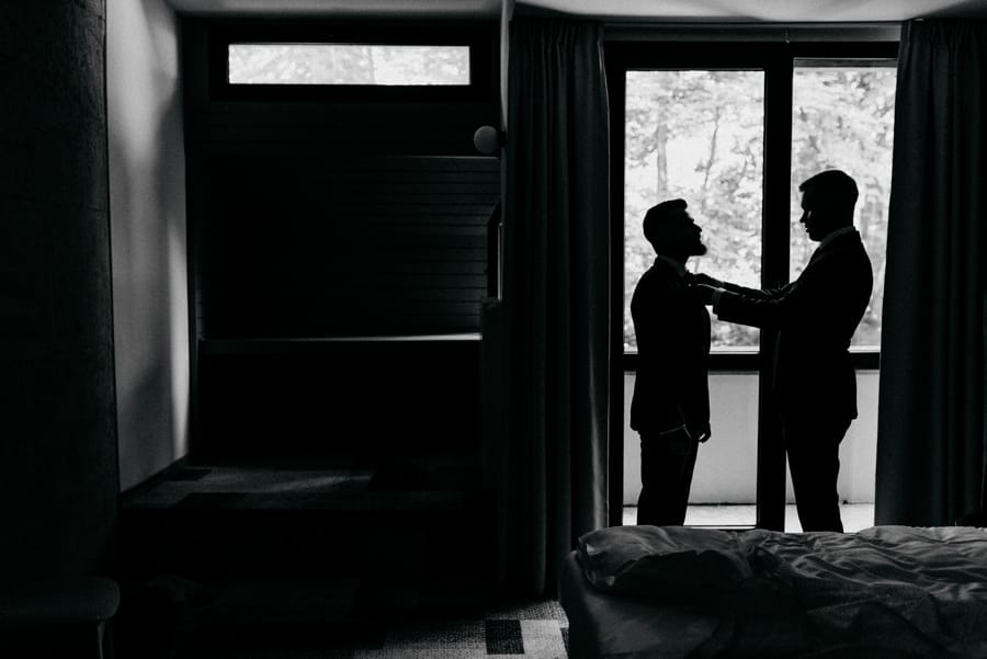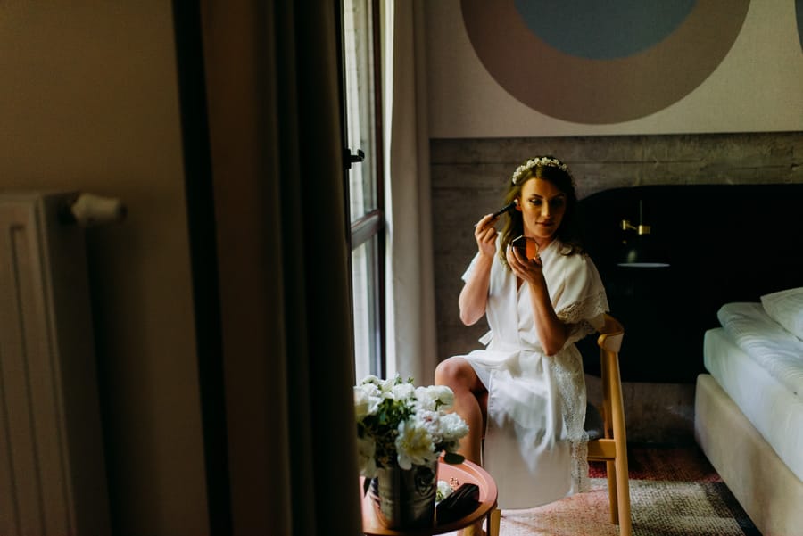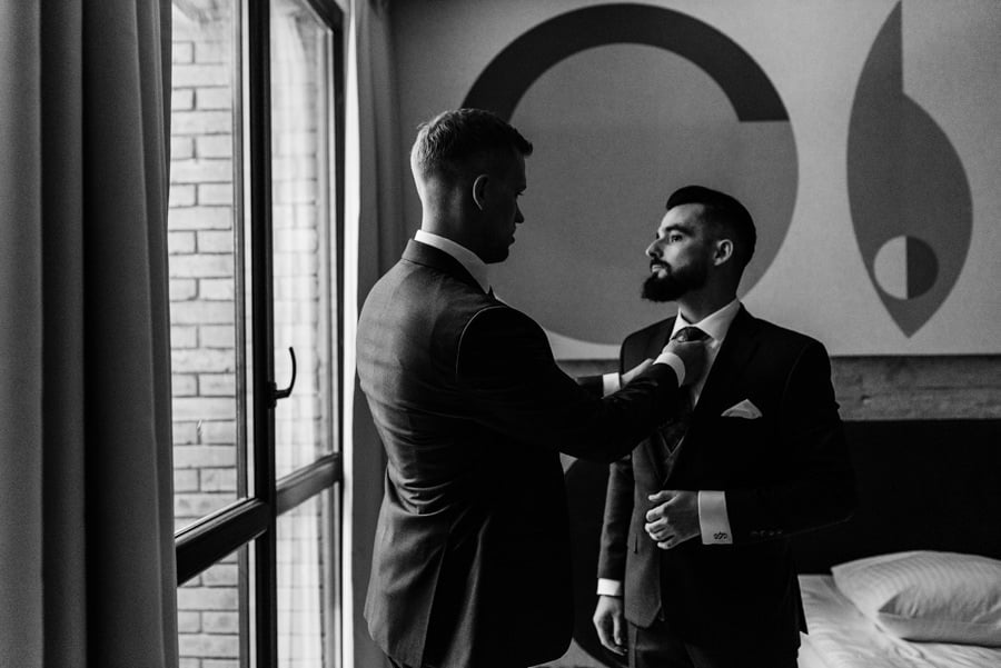 Tomek, jak to Tomek – opanowany, ale z błyskiem w oku, jakby nie mógł się doczekać, aż zobaczy Dominikę w sukni. Apartament wypełniony był światłem, śmiechem i detalami, które pięknie opowiadały ich historię.