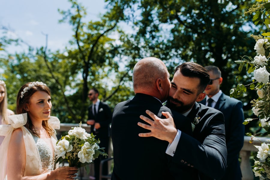 Ceremonia odbyła się na jednym z najbardziej malowniczych tarasów w Krakowie – na szczycie Baszty, skąpanym w słońcu. Wszystko wyglądało jak z filmu: kameralna atmosfera, zieleń w tle, rozświetlone twarze gości i dwójka ludzi, którzy patrzyli na siebie z taką czułością, że nawet obiektyw nie był w stanie tego w pełni oddać.