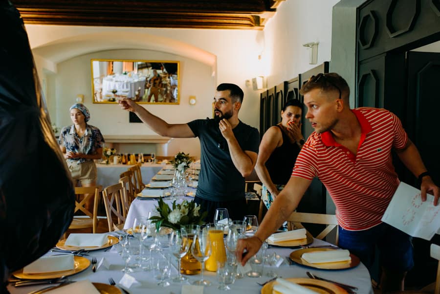 Zaraz po wzruszającej ceremonii przyszedł czas na obiad – serwowany w eleganckiej i przytulnej części Baszty. Goście delektowali się pysznym jedzeniem i winem, rozmawiali, śmiali się – wszystko w spokojnej, niemal rodzinnej atmosferze.